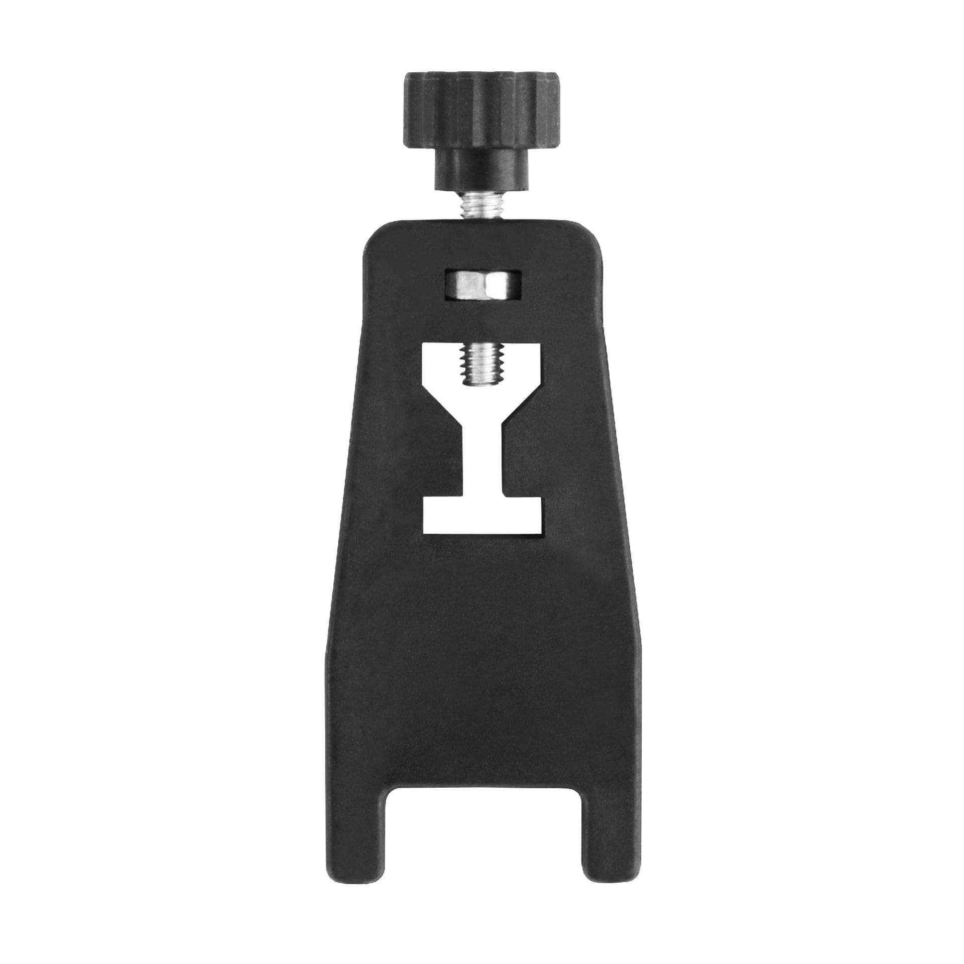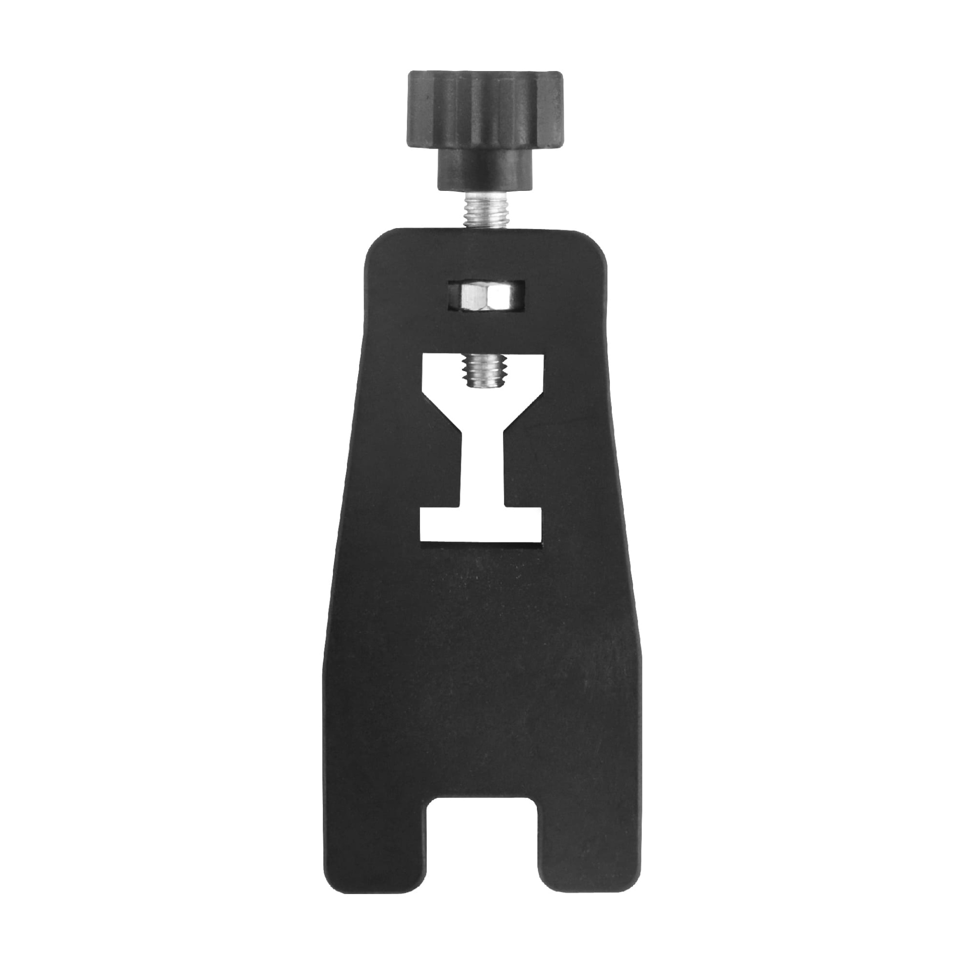 Ferramenta preta com botão de aperto serrilhado e orifício em 'Y' central
