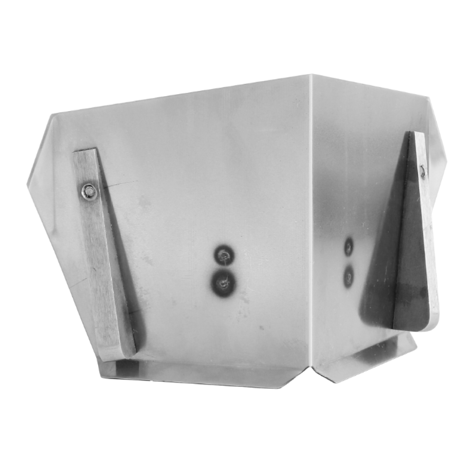 Suporte metálico de parede cinza com quatro parafusos e dois suportes laterais