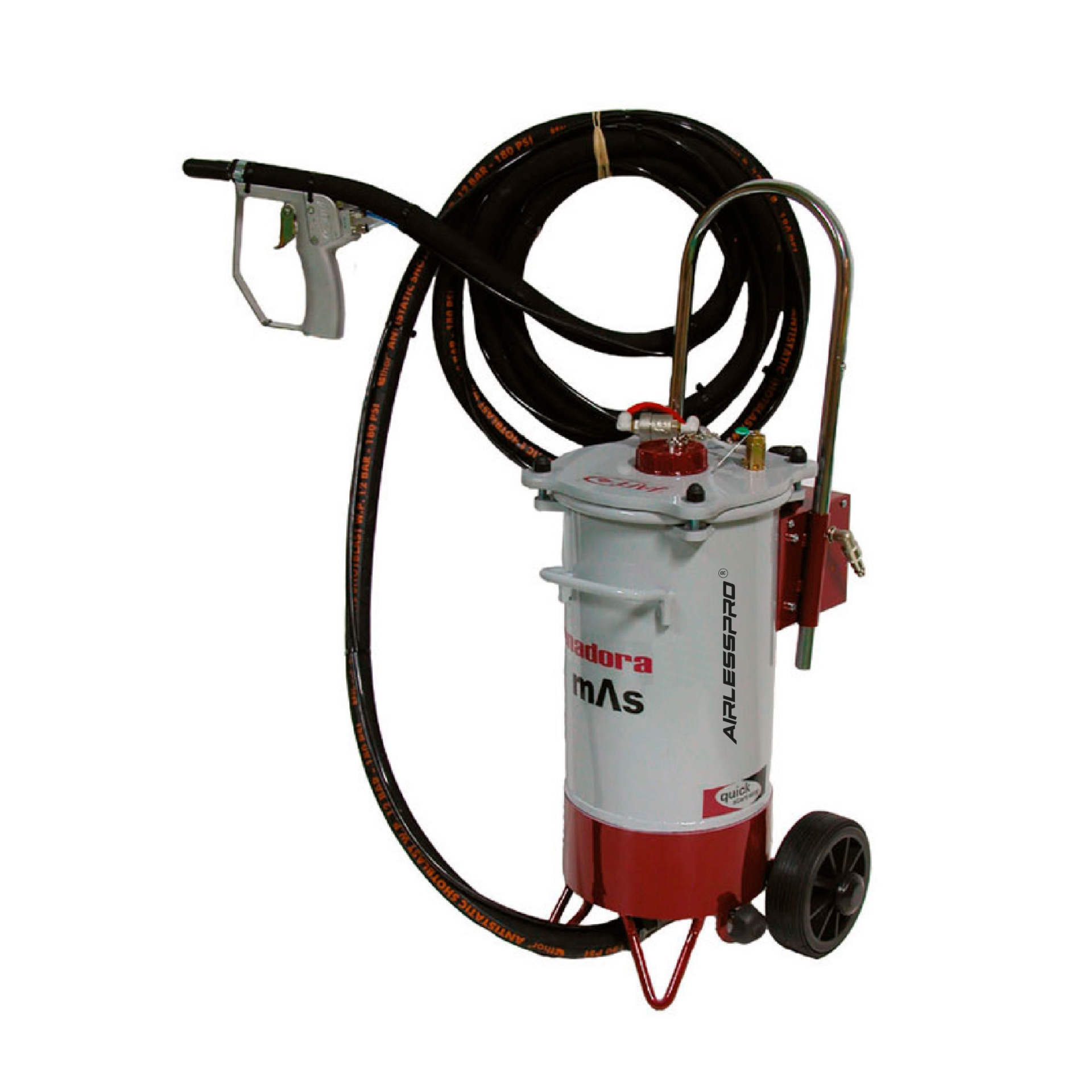 Depósito móvel para pintura branco e vermelho com mangueira preta e pistola