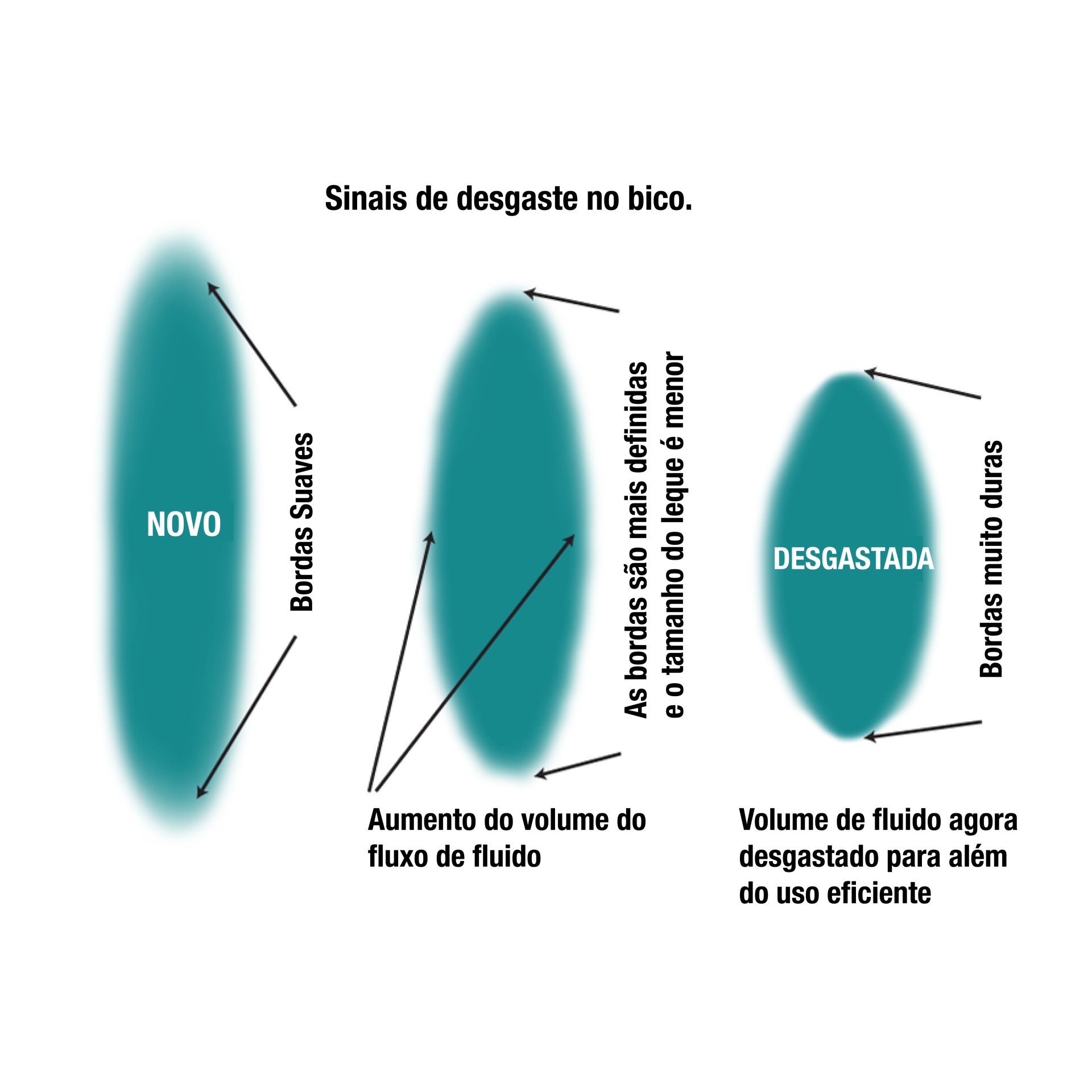 Três gotas de tinta azul turquesa rotuladas como novo, uso intermédio e desgastado com indicações de desgaste nas bordas.