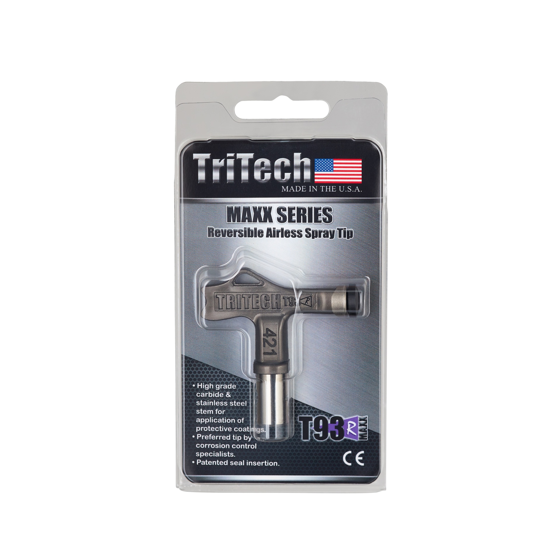 Spray tip TriTech MAXX SERIES T93R em embalagem transparente com cartão cinzento e preto