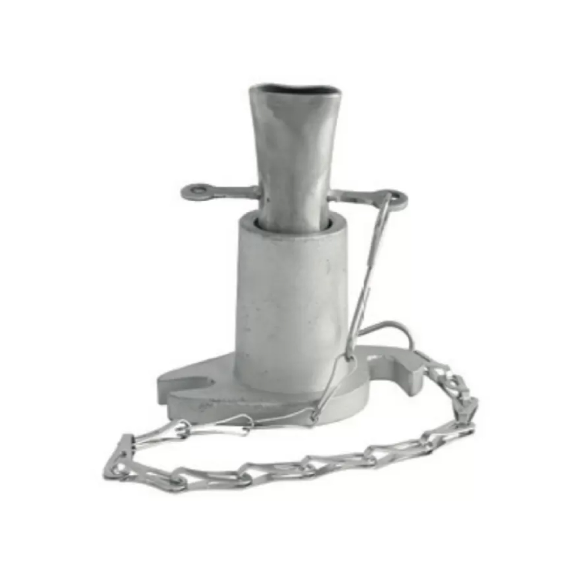 Dispositivo metálico prateado com base, peça cilíndrica e corrente