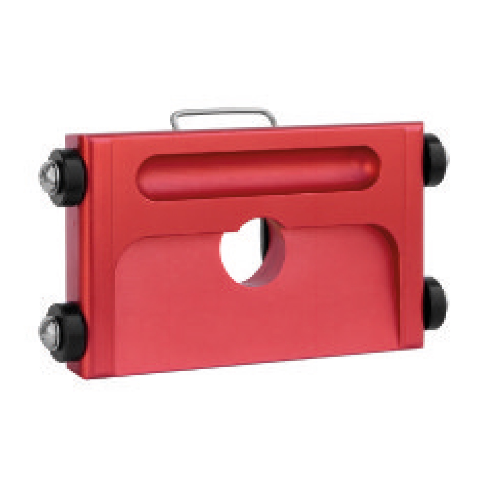 Dispositivo retangular vermelho com pega metálica e quatro rodas pretas