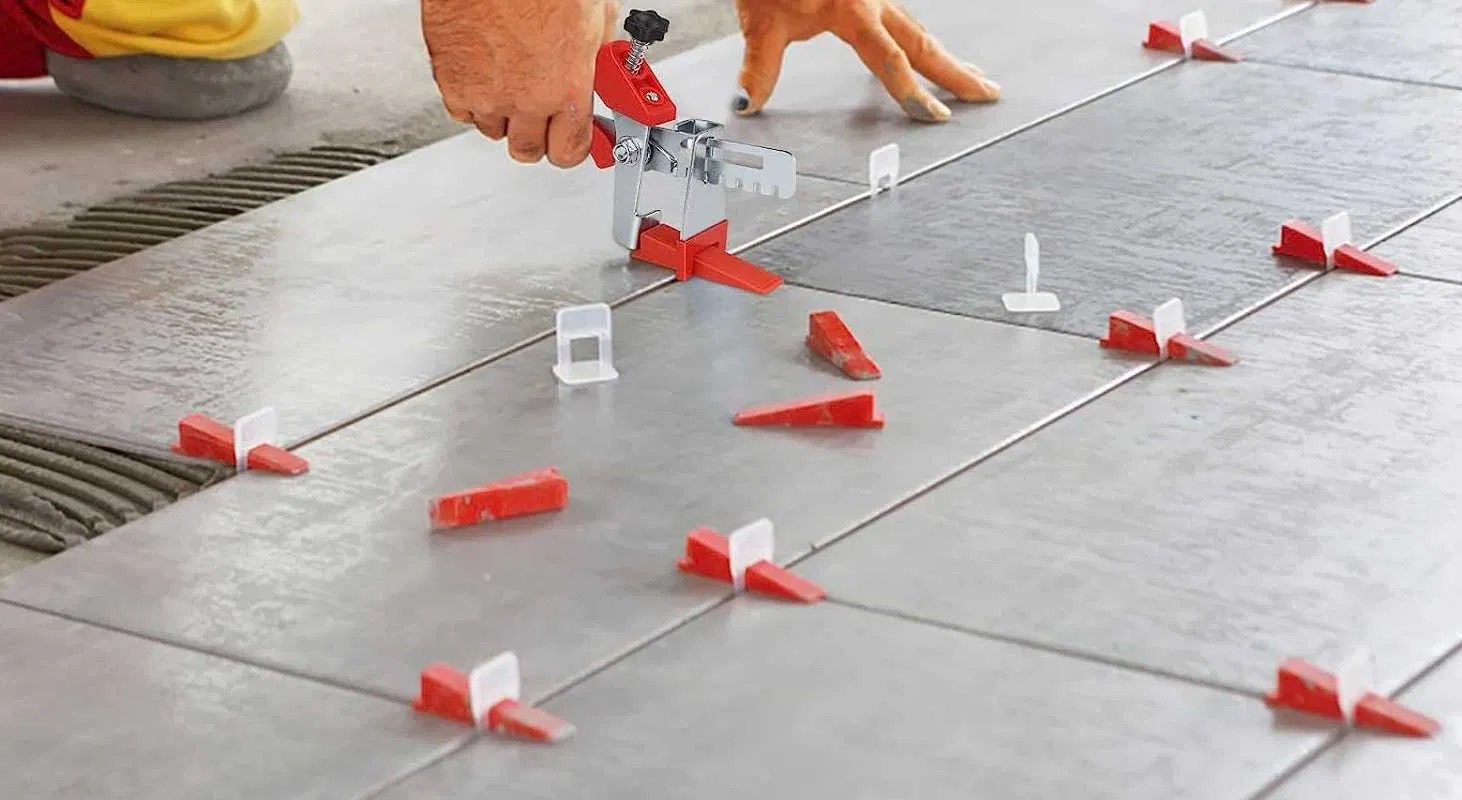 Pessoa a usar ferramenta de nivelamento em azulejos cinzentos com espaçadores vermelhos e brancos