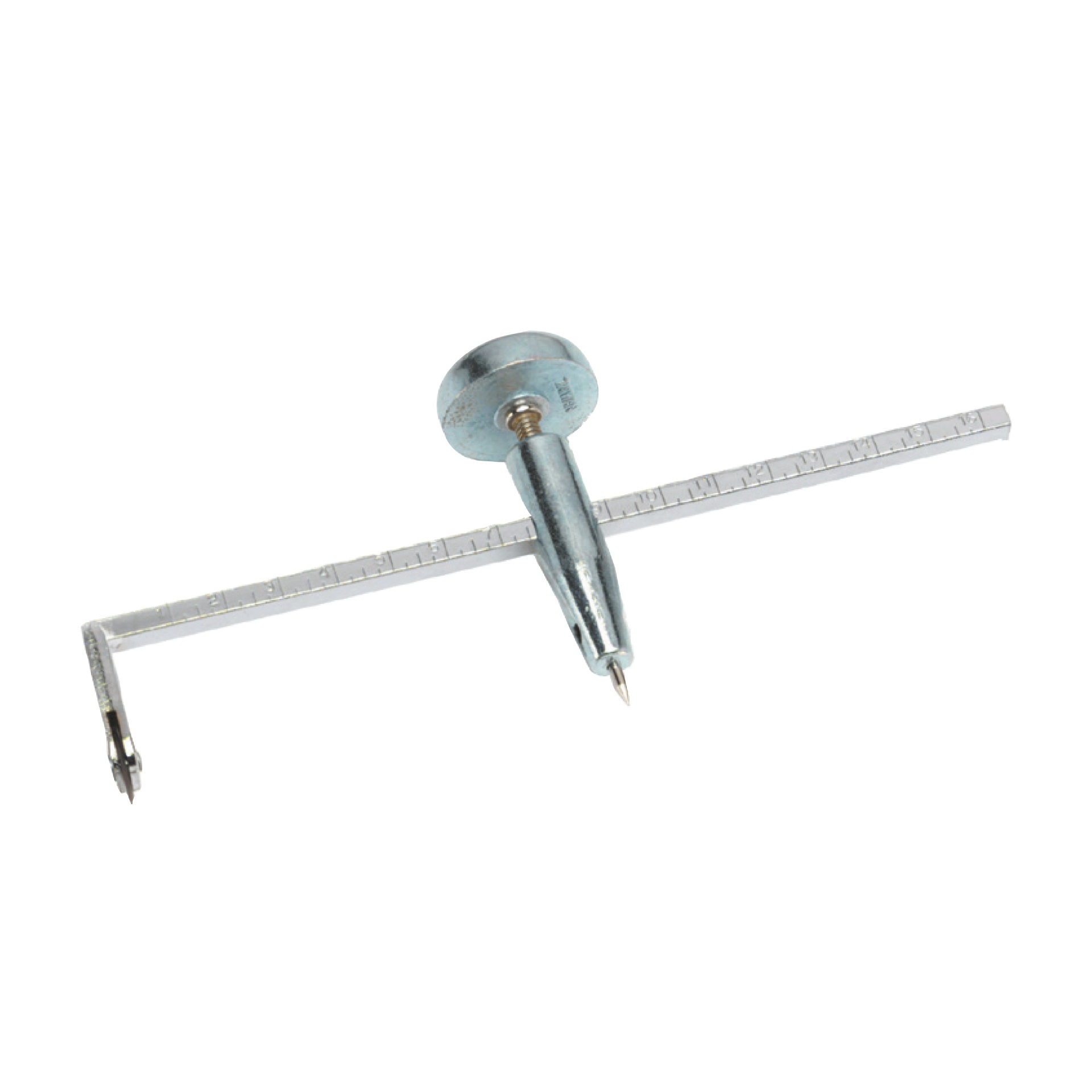 Instrumento de desenho metálico prateado com régua e ponto de apoio circular