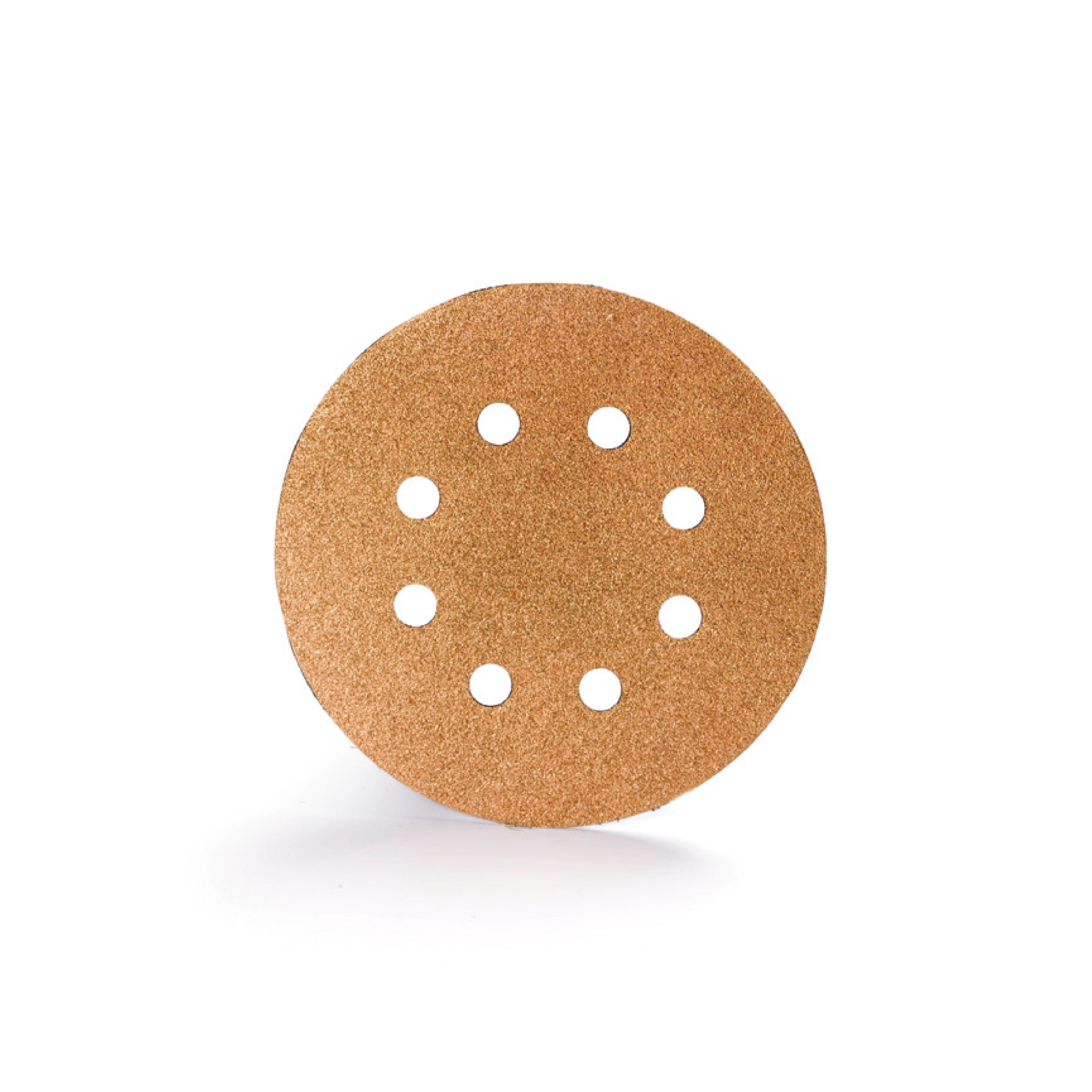 Disco abrasivo redondo castanho com oito furos num fundo branco