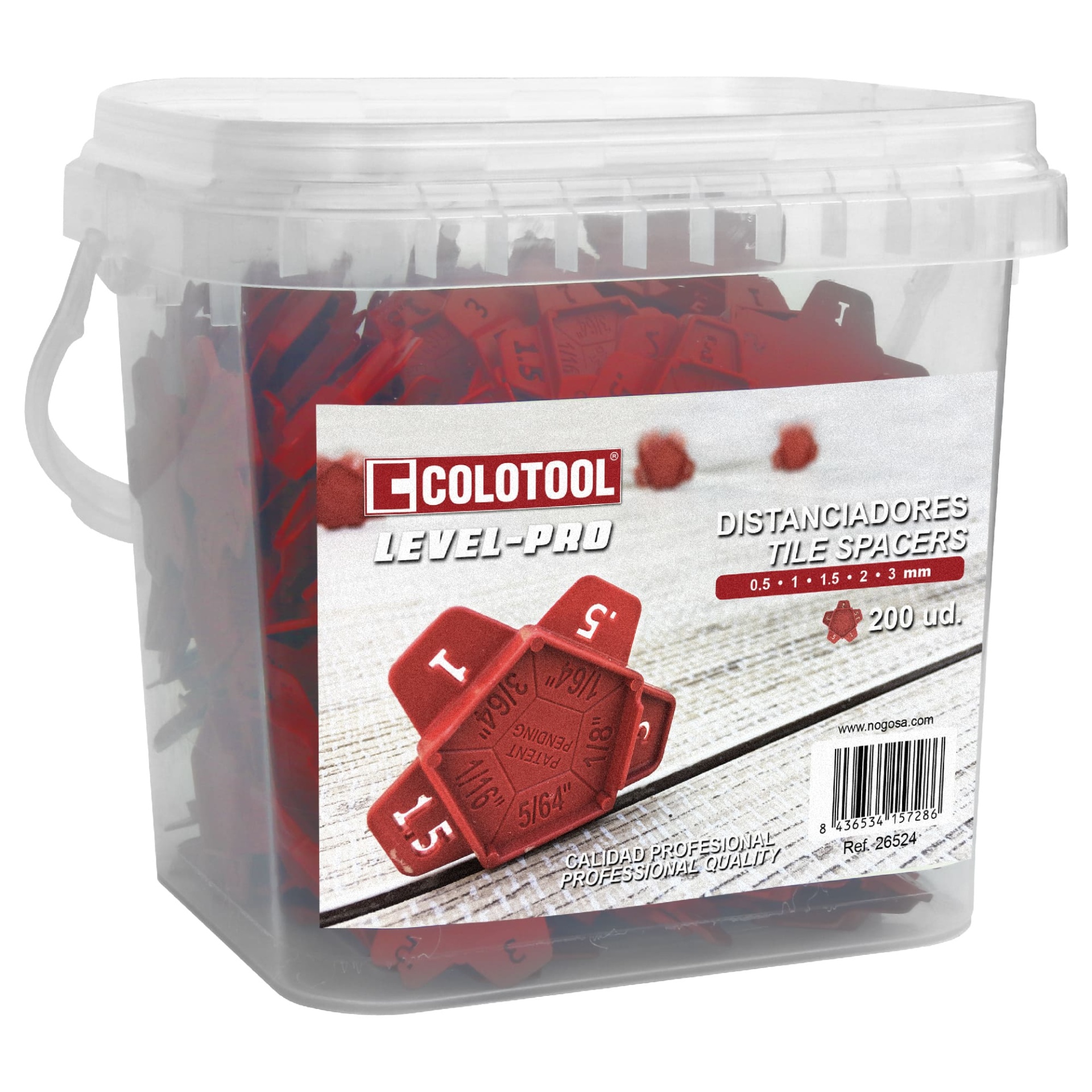 Niveladores vermelhos com números dentro de balde transparente da marca COLOTOOL