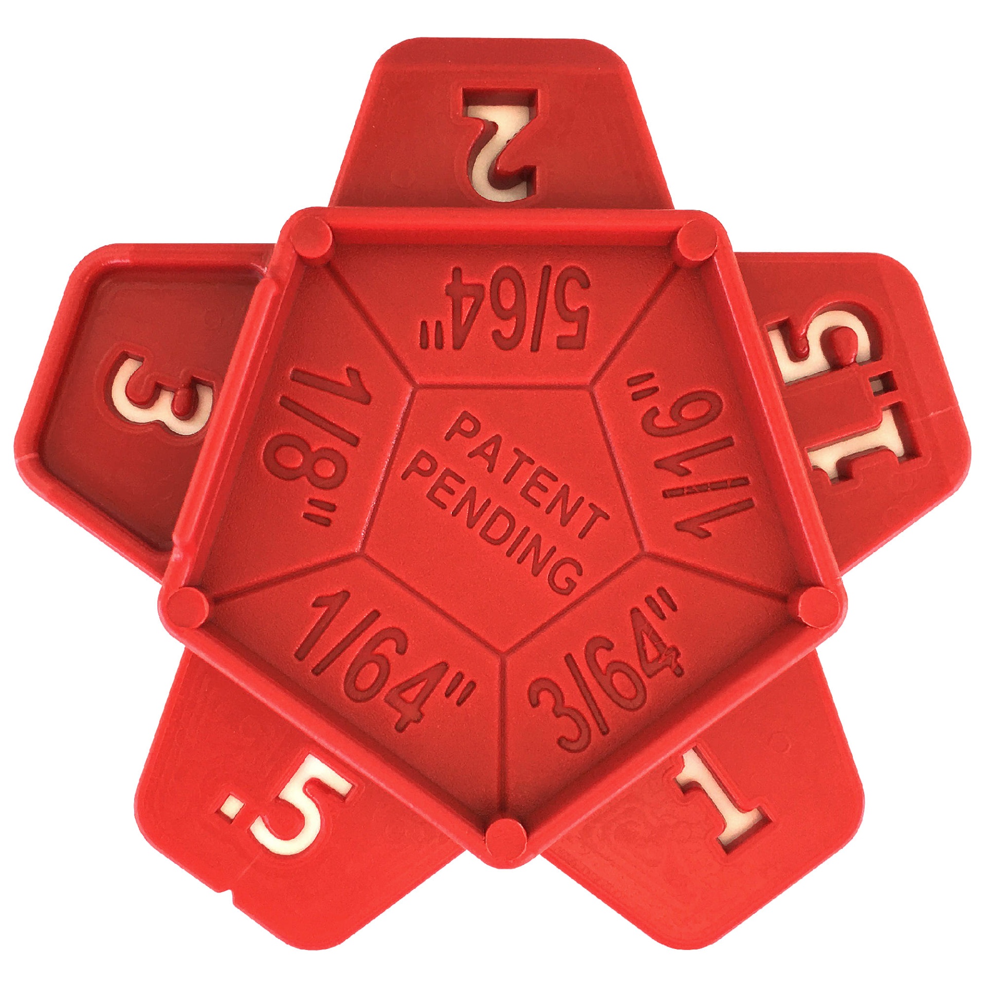 Dispositivo plástico vermelho com medidas em polegadas gravadas.