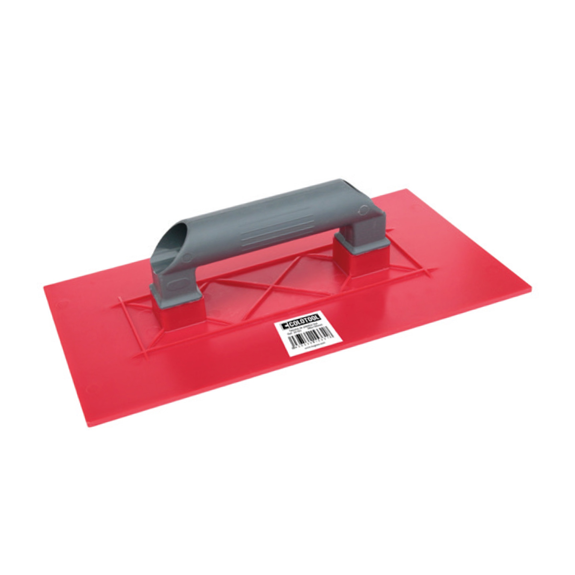 Plaina de plástico vermelha com pega cinzenta e etiqueta com código de barras