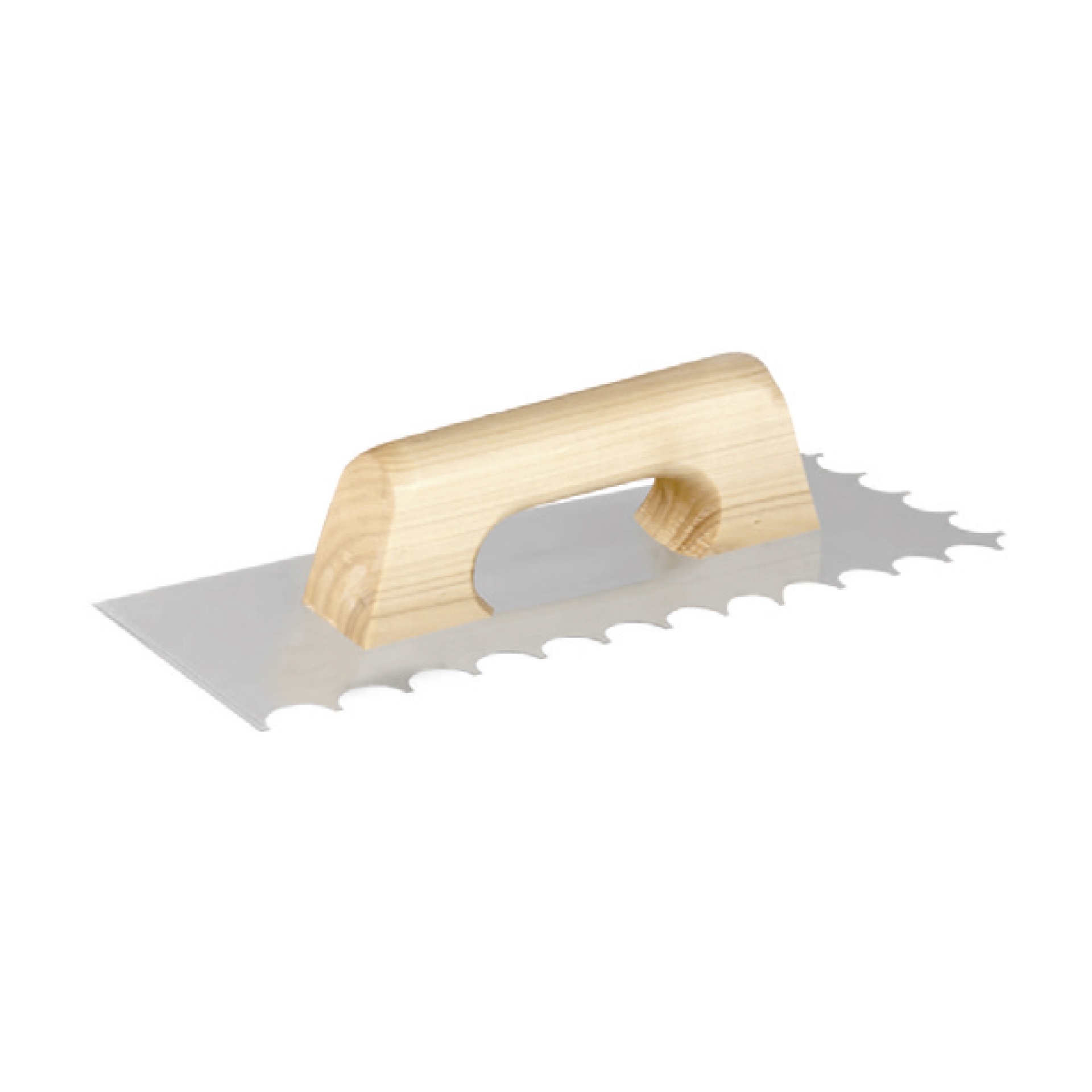 Espátula de aço com cabo de madeira clara e lâmina serrilhada em ondas