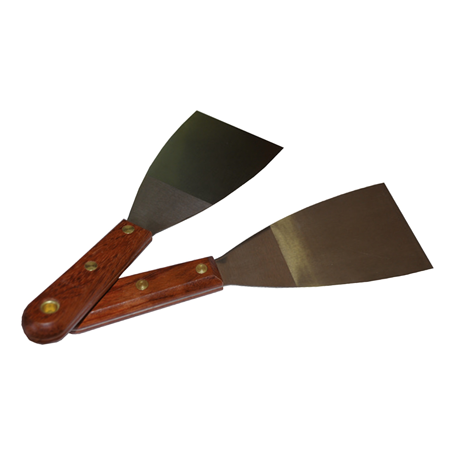 Espátulas metálicas com cabos de madeira escura sobre fundo branco