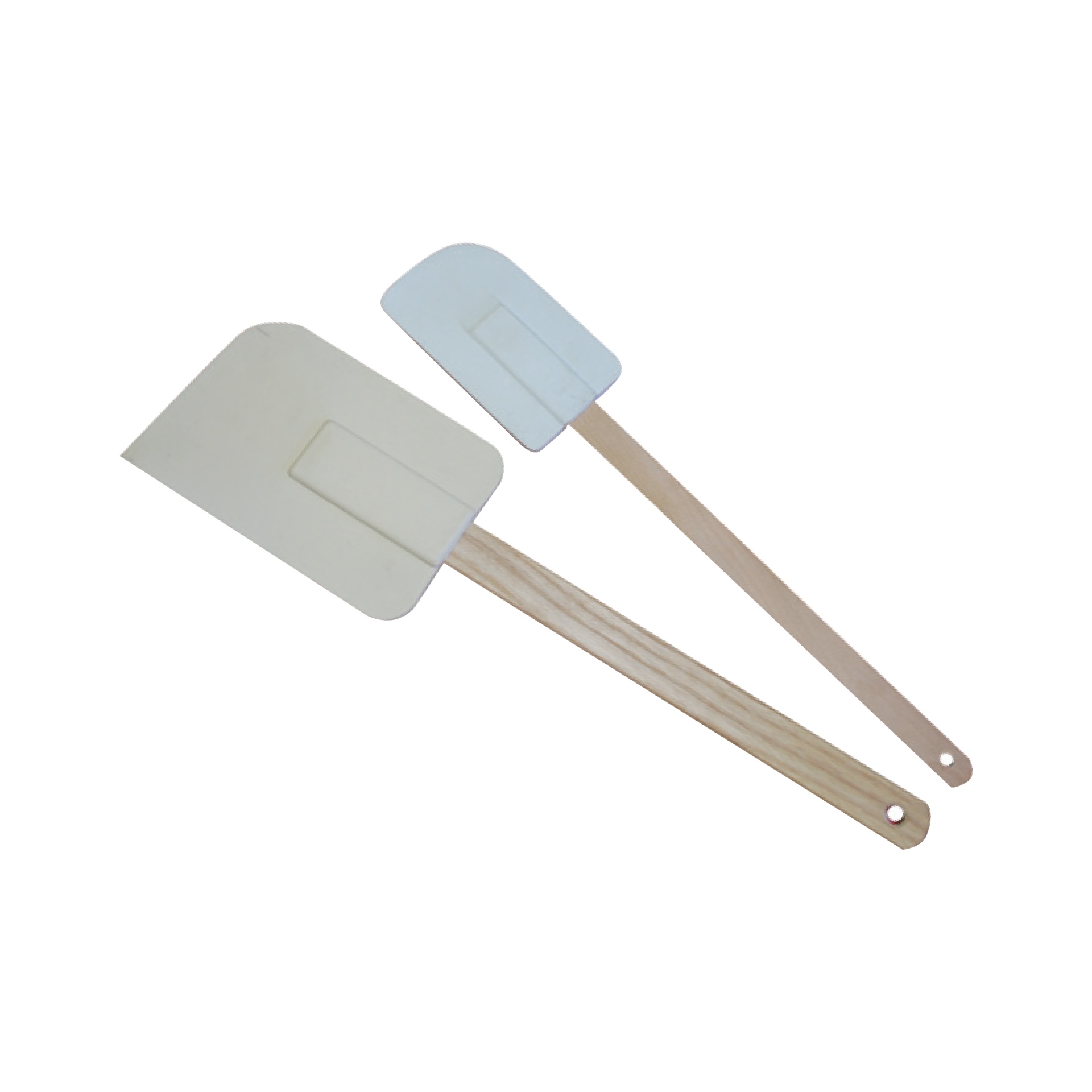 Duas espátulas de cozinha com cabos de madeira e lâminas de silicone azul clara e branca