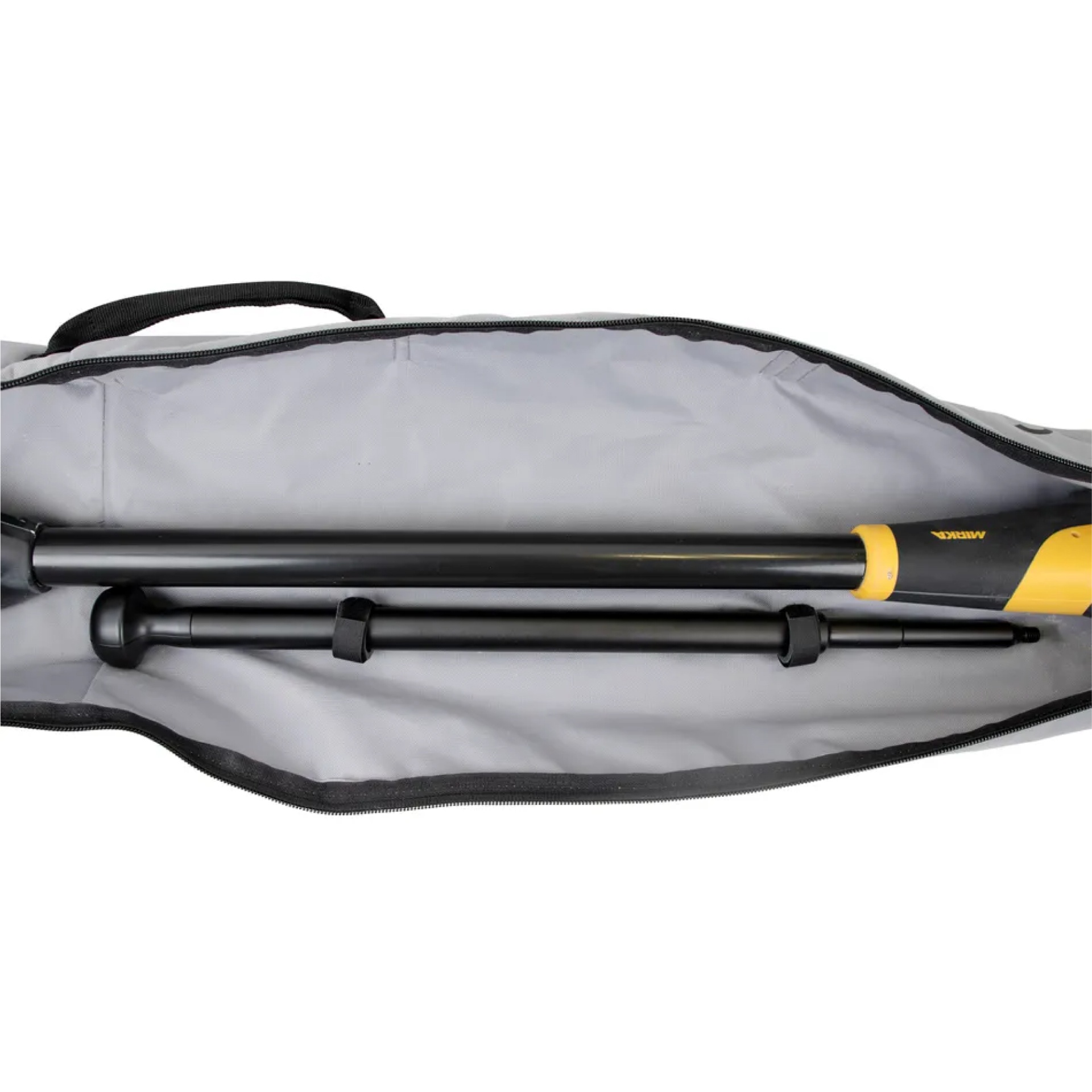 Bolsa cinza aberta com duas peças metálicas pretas guardadas no interior.