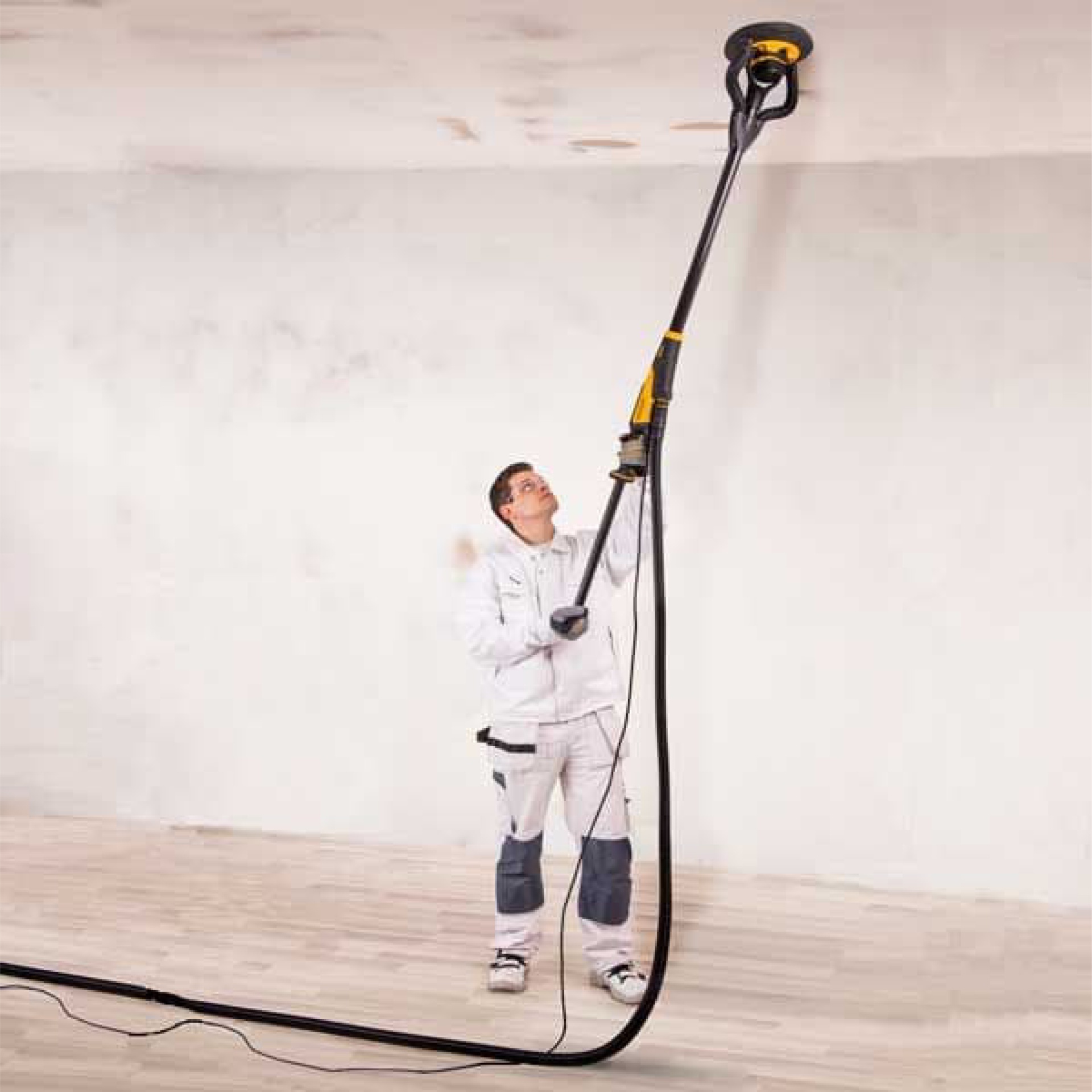 Homem a usar lixadora elétrica de parede com cabo longo para alisar teto