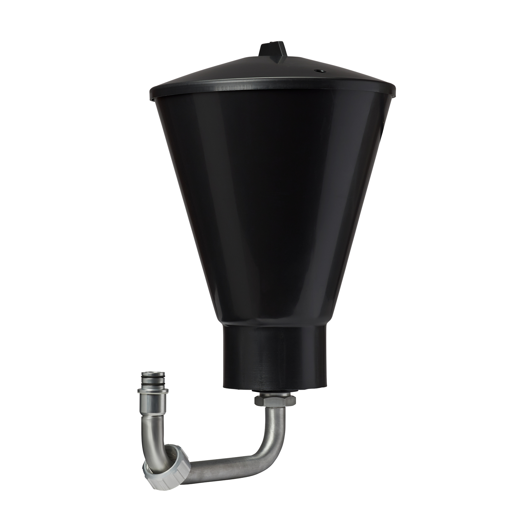 Funil antiderrame preto com tubo metálico cinzento curvado