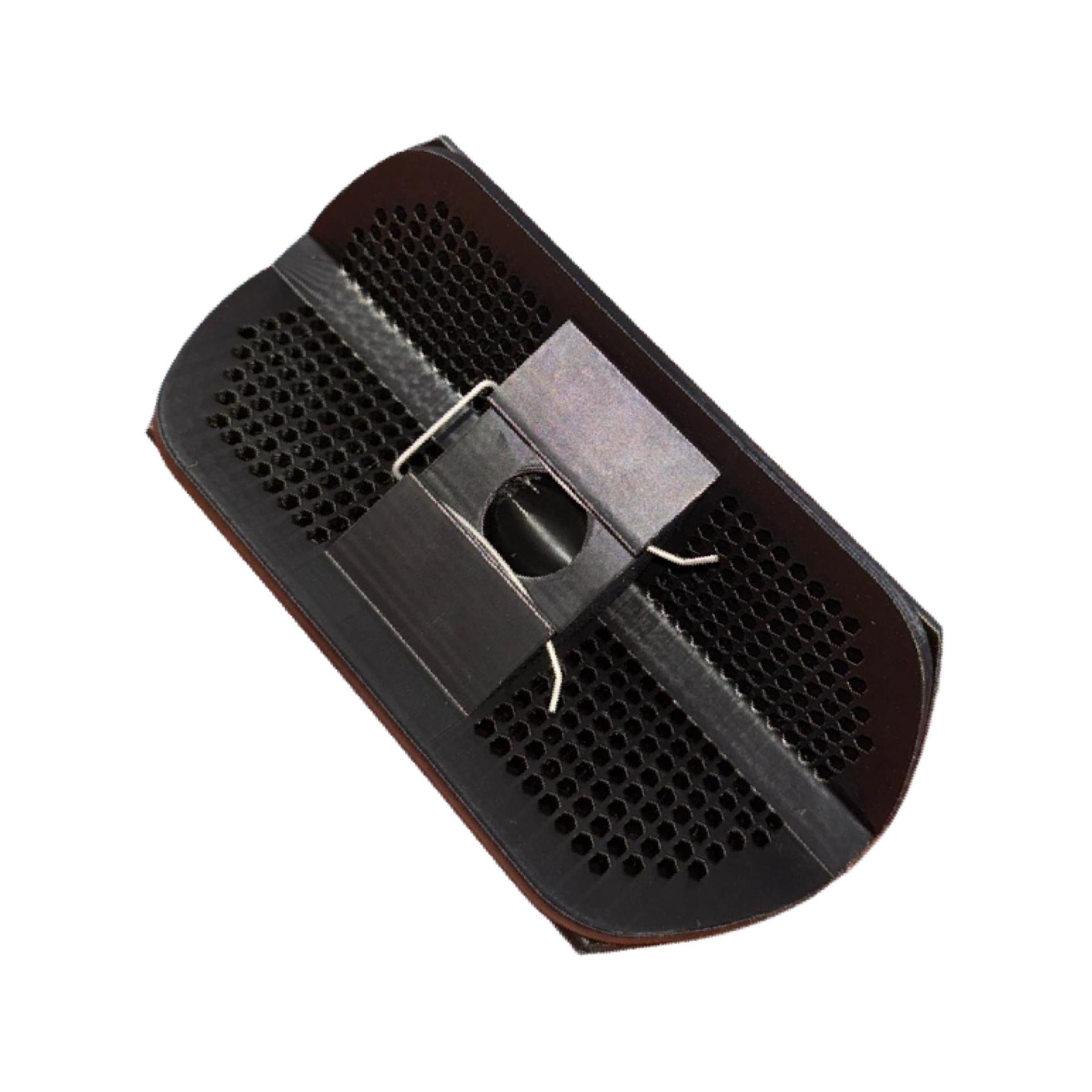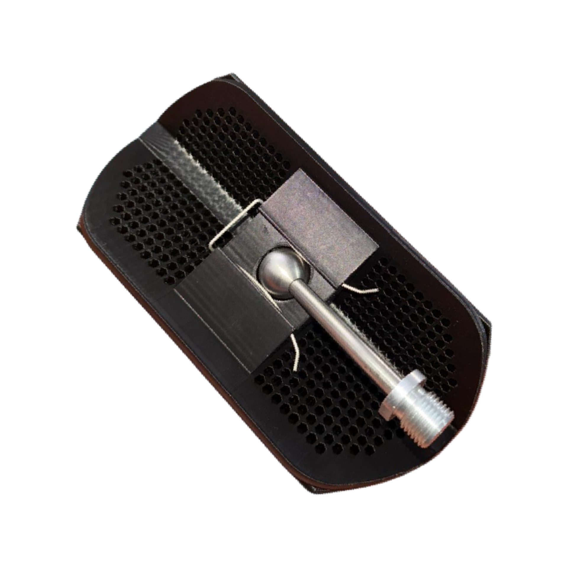 Base preta com orifícios hexagonais e suporte metálico prateado