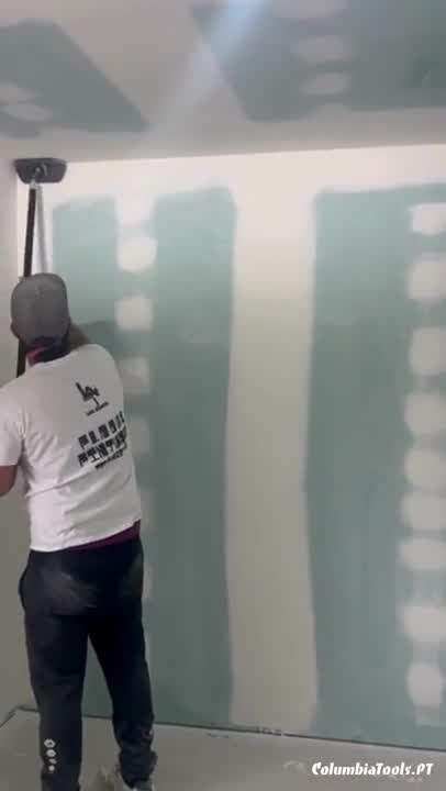 Homem a lixar parede com lixadora de cabo longo numa divisão com placas de gesso azul e branco.