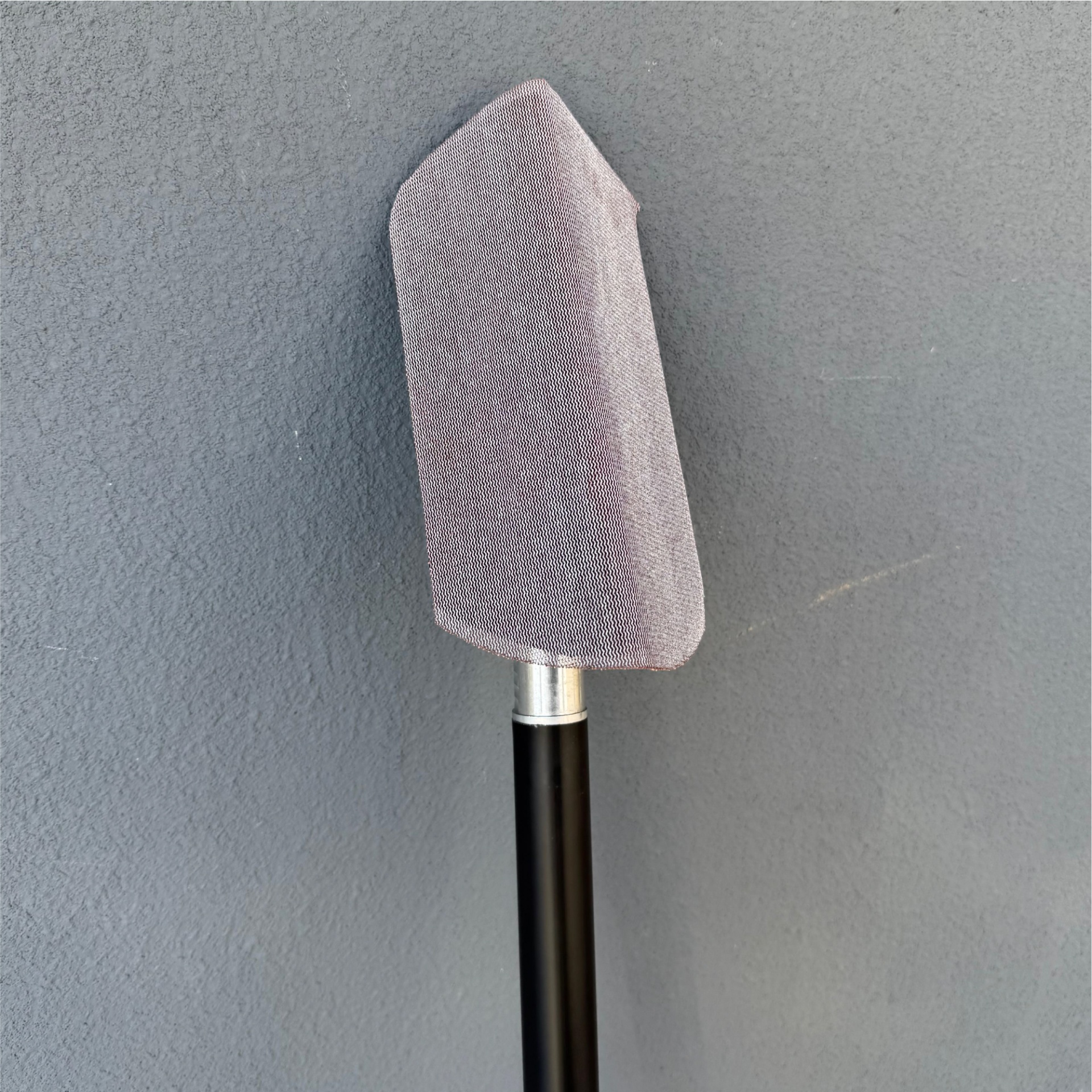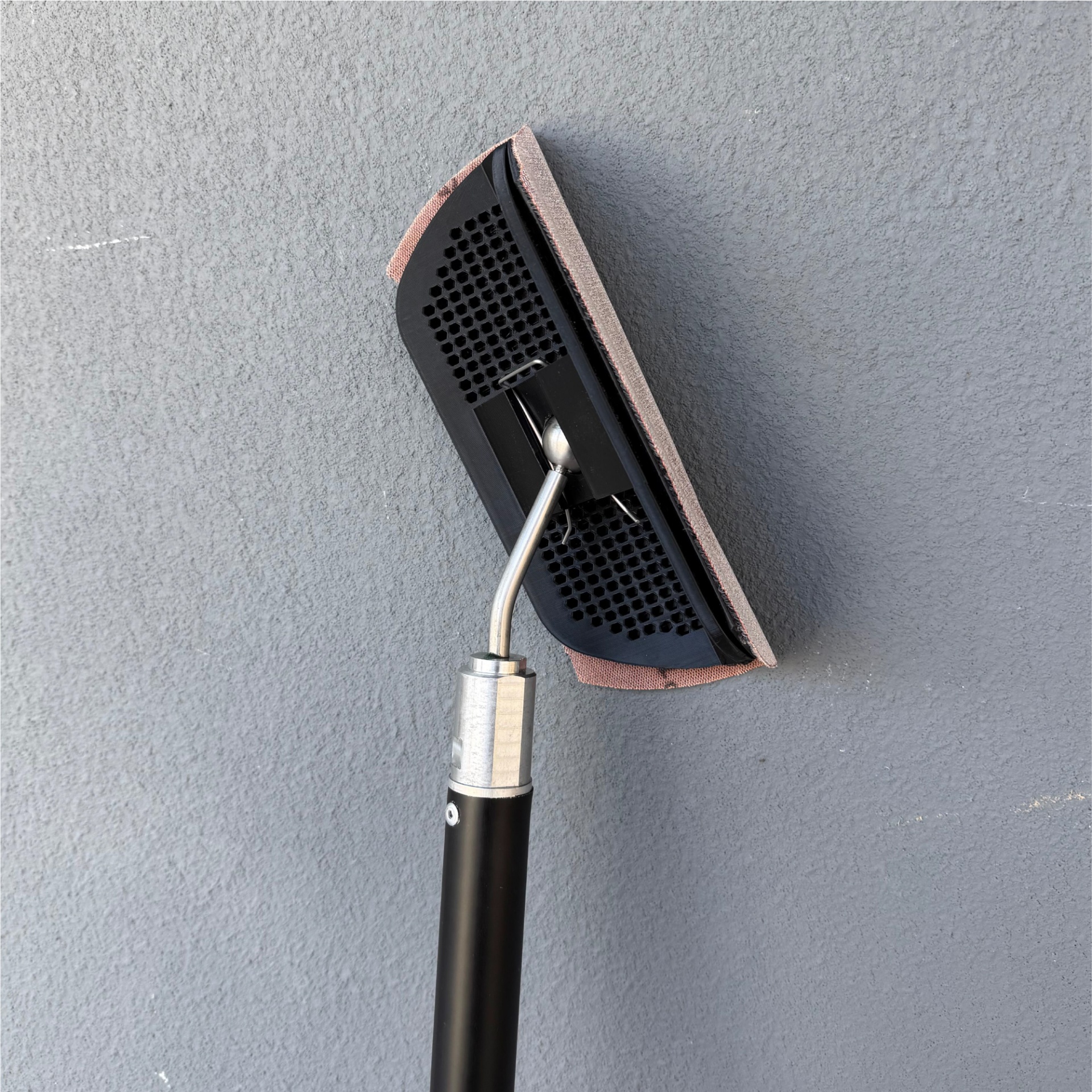 Esfregona preta com cabo e superfície de contacto rosa encostada a uma parede cinza