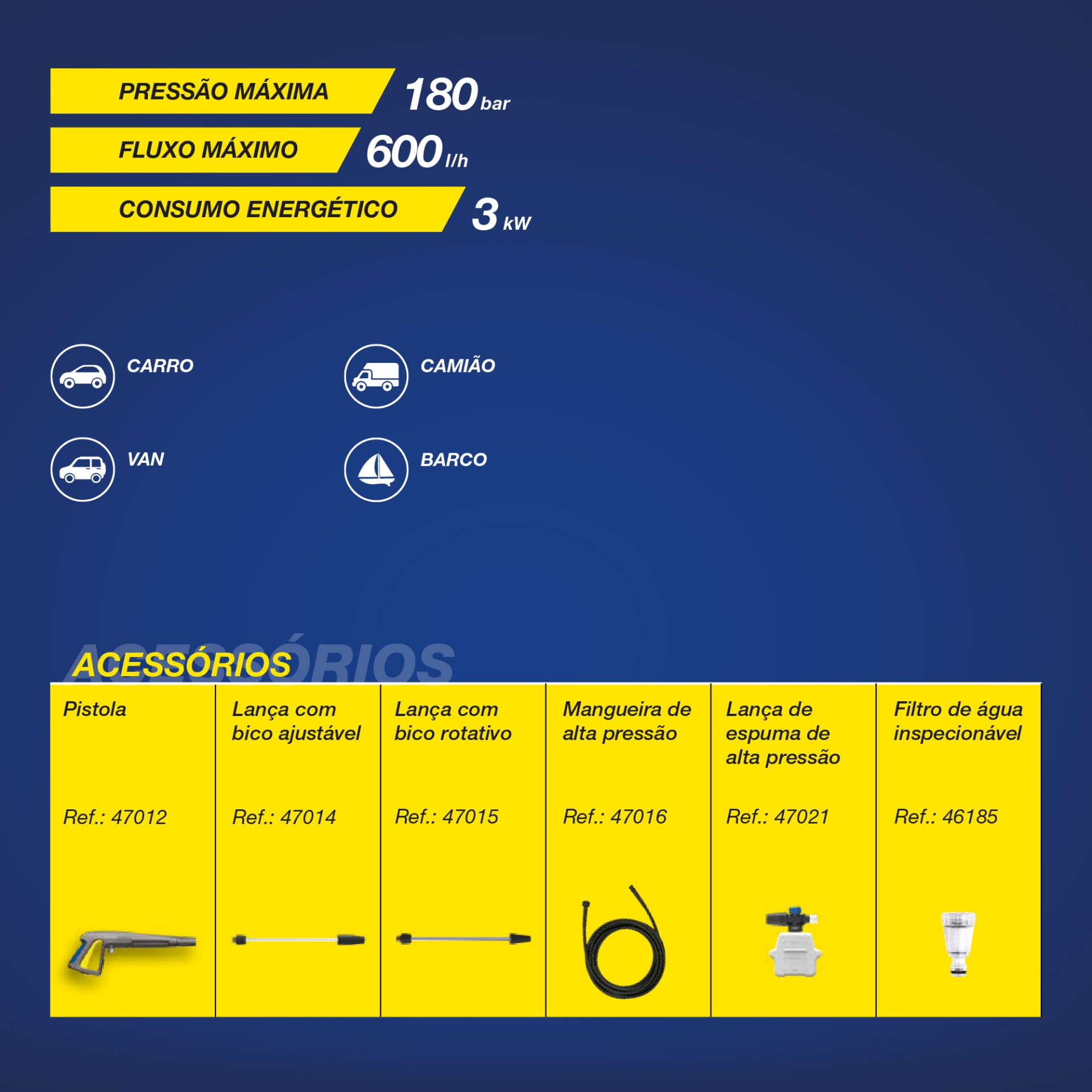 - Carro de duas rodas com pega e enrolador de mangueira (mangueira de alta pressão reforçada de 10 m)
