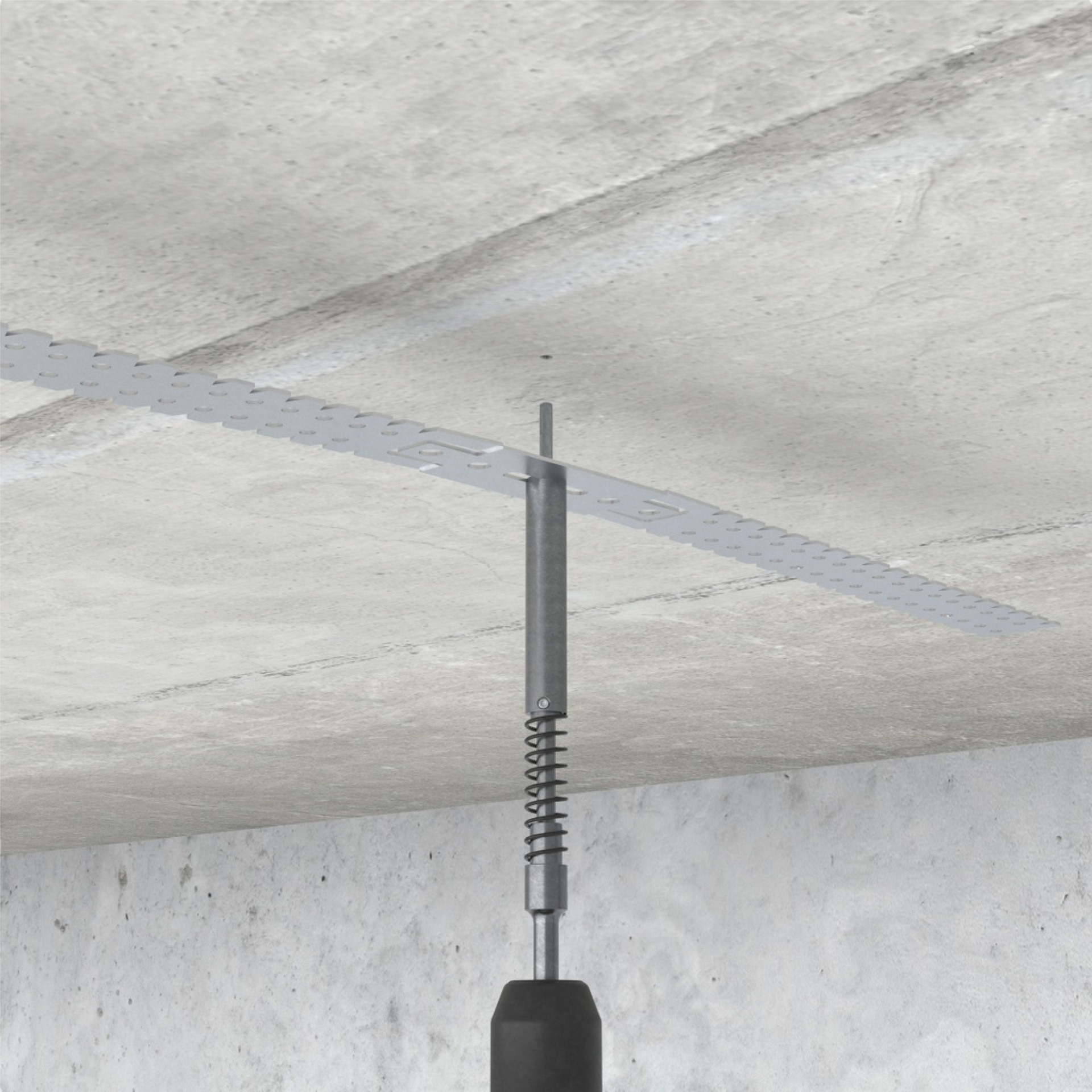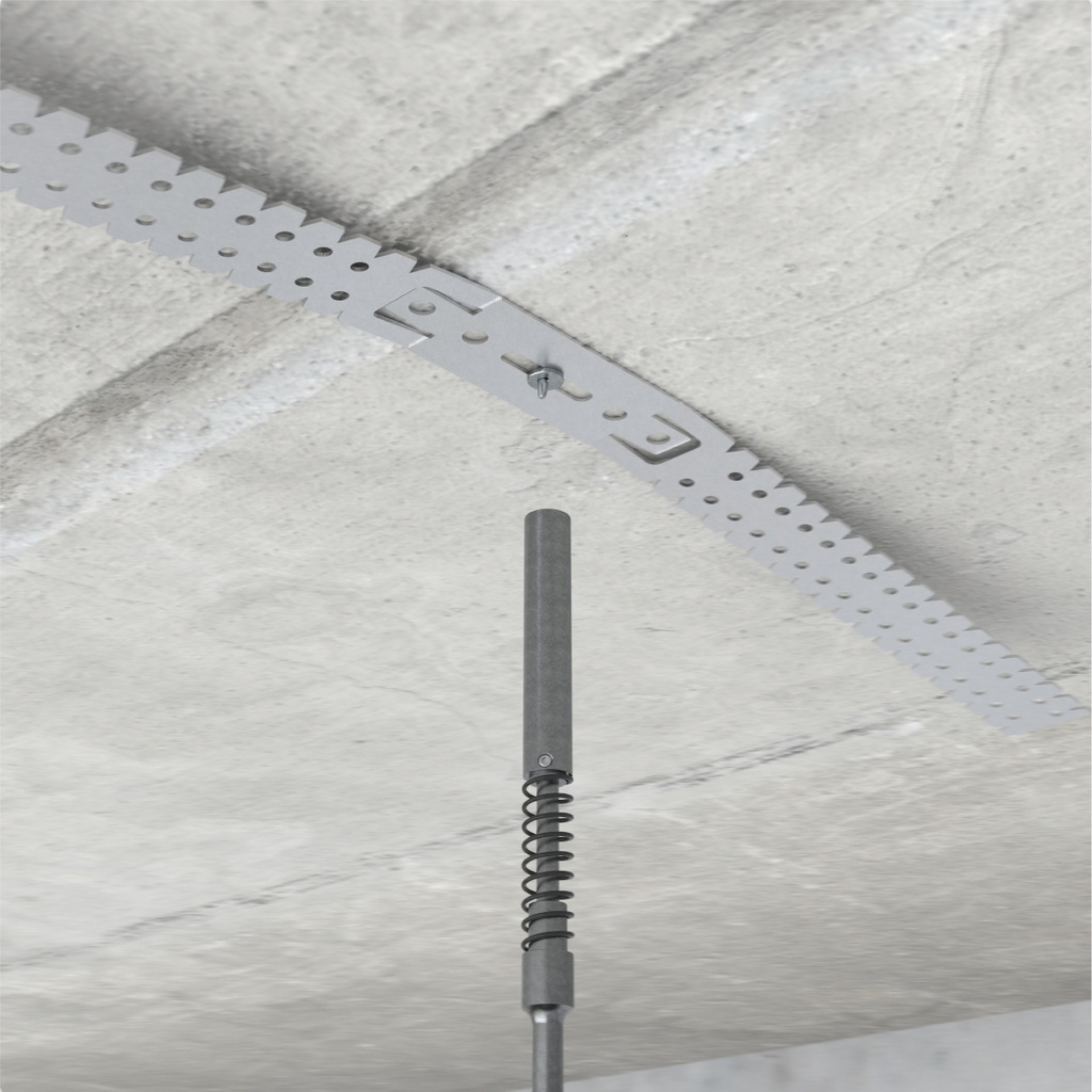 Sistema de suporte metálico para tetos falsos fixado em teto de betão.