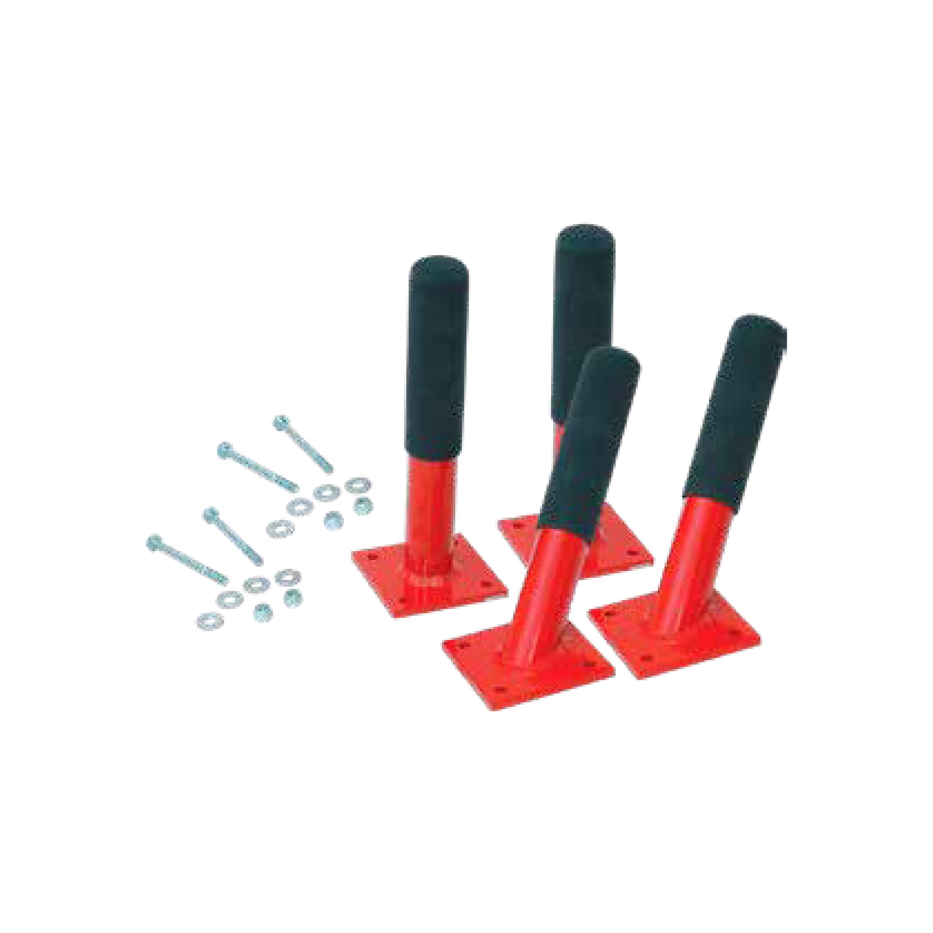 Suportes vermelhos inclinados com pegadores pretos e parafusos