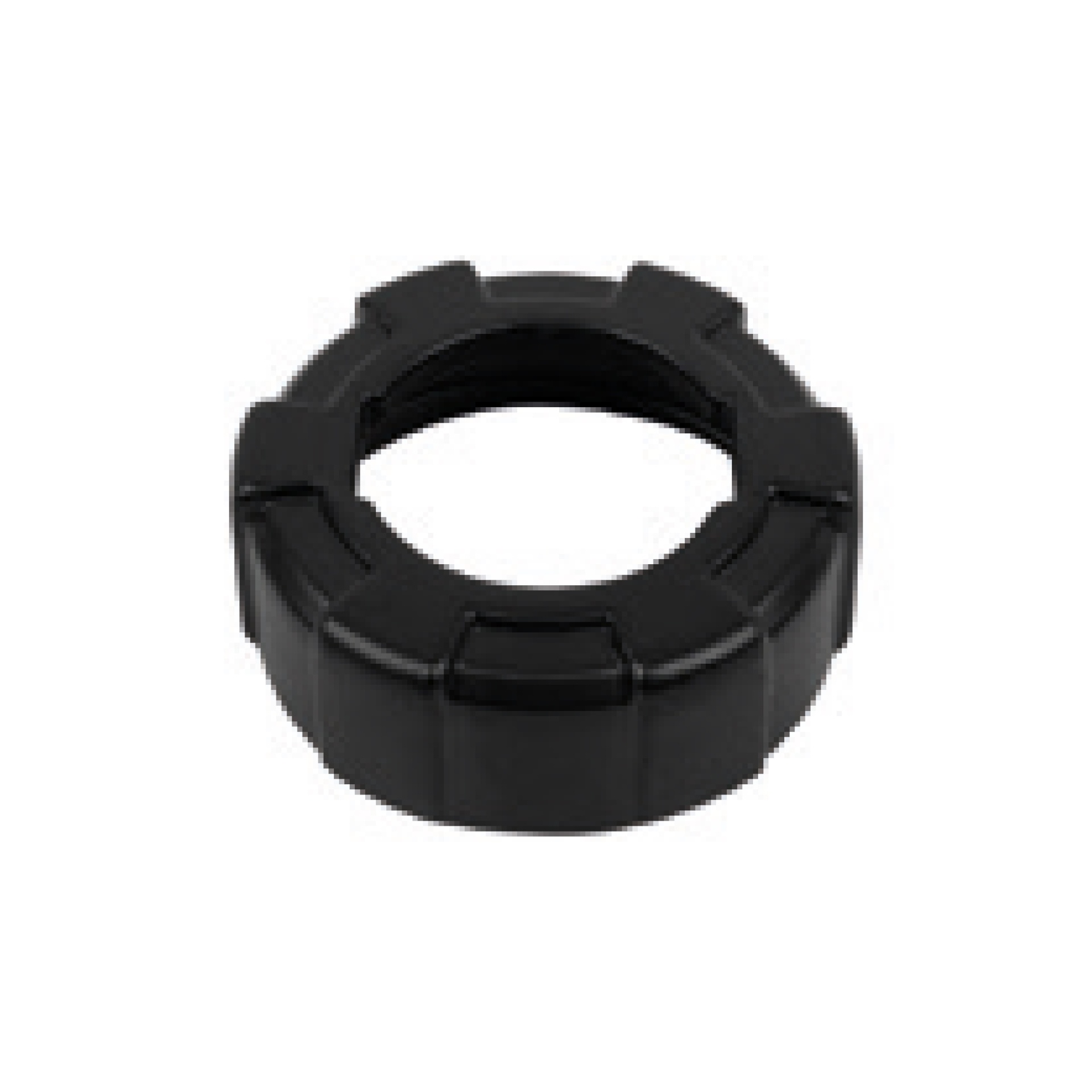 Peça circular preta em plástico, com formato segmentado.