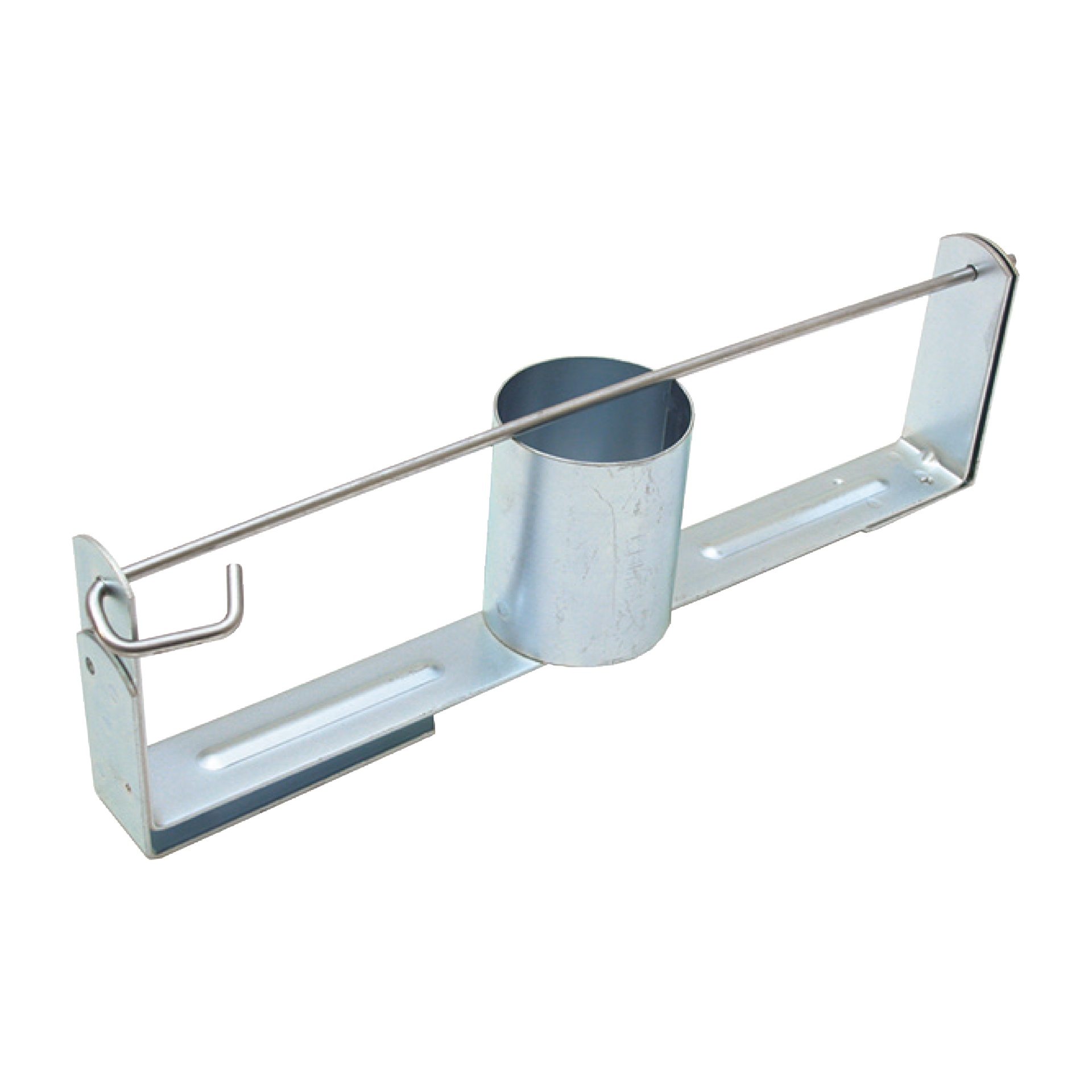 Suporte metálico galvanizado com tubo cilíndrico e barra com gancho.