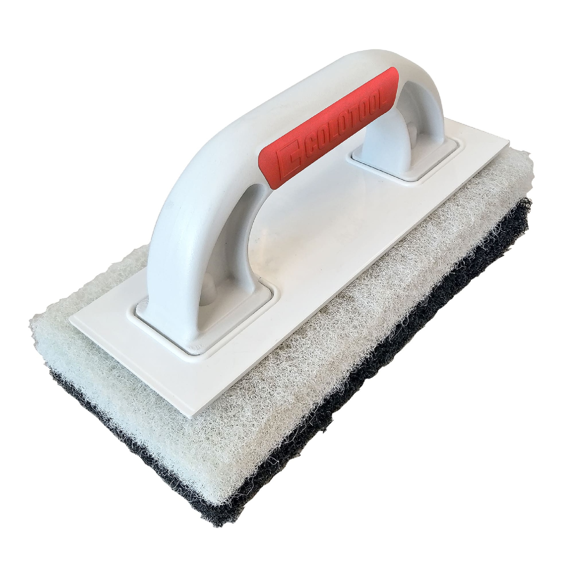 Esfregão de limpeza branco com pega vermelha e esponjas preta e cinza
